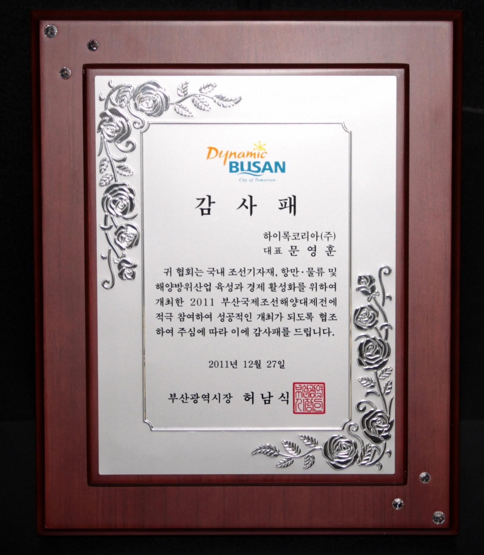 2011년 부산국제조선해양대제전 감사패 수상 - 부산광역시