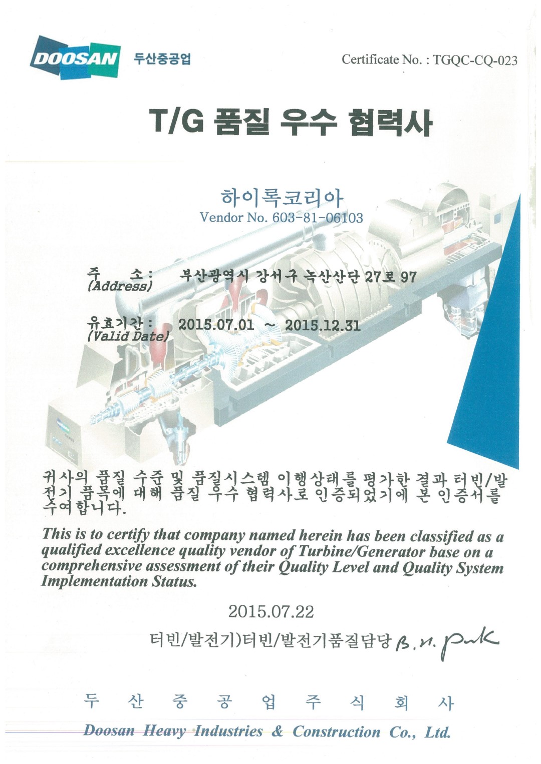 터빈/발전기 품질 우수 협력사 선정 - 두산중공업