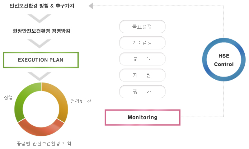 생산활동 중에 발생할 수 있는 비상사태의 잠재가능성을 파악하고 사전 예비 대책을 추진함으로써 사고 발생요인을 근본적으로 차단하고 비상사태 발생 시 사고 유형에 따라 현장에서 신속, 정확하게 대처할 수 있도록 기본 지침을 미련하여 훈련ㆍ교육하고 있습니다.