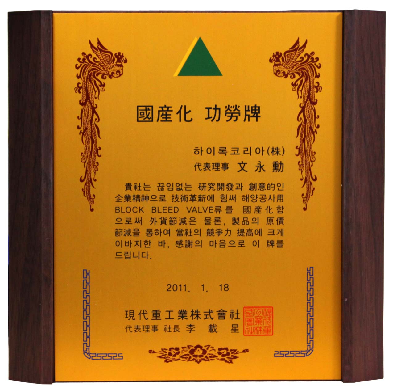 하이록 코리아㈜가 2011년 1월 18일 현대중공업으로부터 해양공사용 Block Bleed Valve 국산화 공로를 인정 받아 공로패를 수상 했습니다.