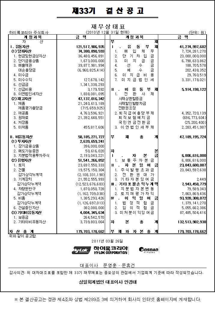 | 감사의견: 위 대차대조표를 포함한 제 33기 재무제표는 중요성의 관점에서 기업회계 기준에 따라 작성되었습니다. | ||||