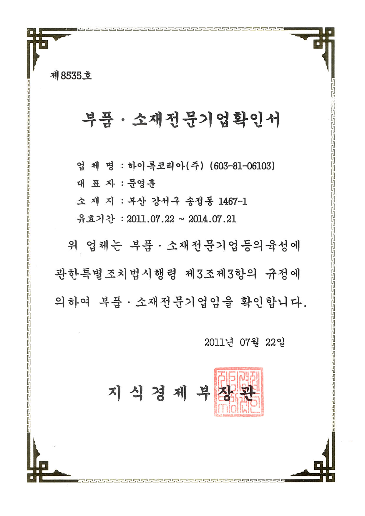 저희 하이록코리아(주)는 지난 7월 22일 지식경제부로부터 부품·소재 전문기업으로 인정·확인받았습니다. 이번 인정확인은 2011년