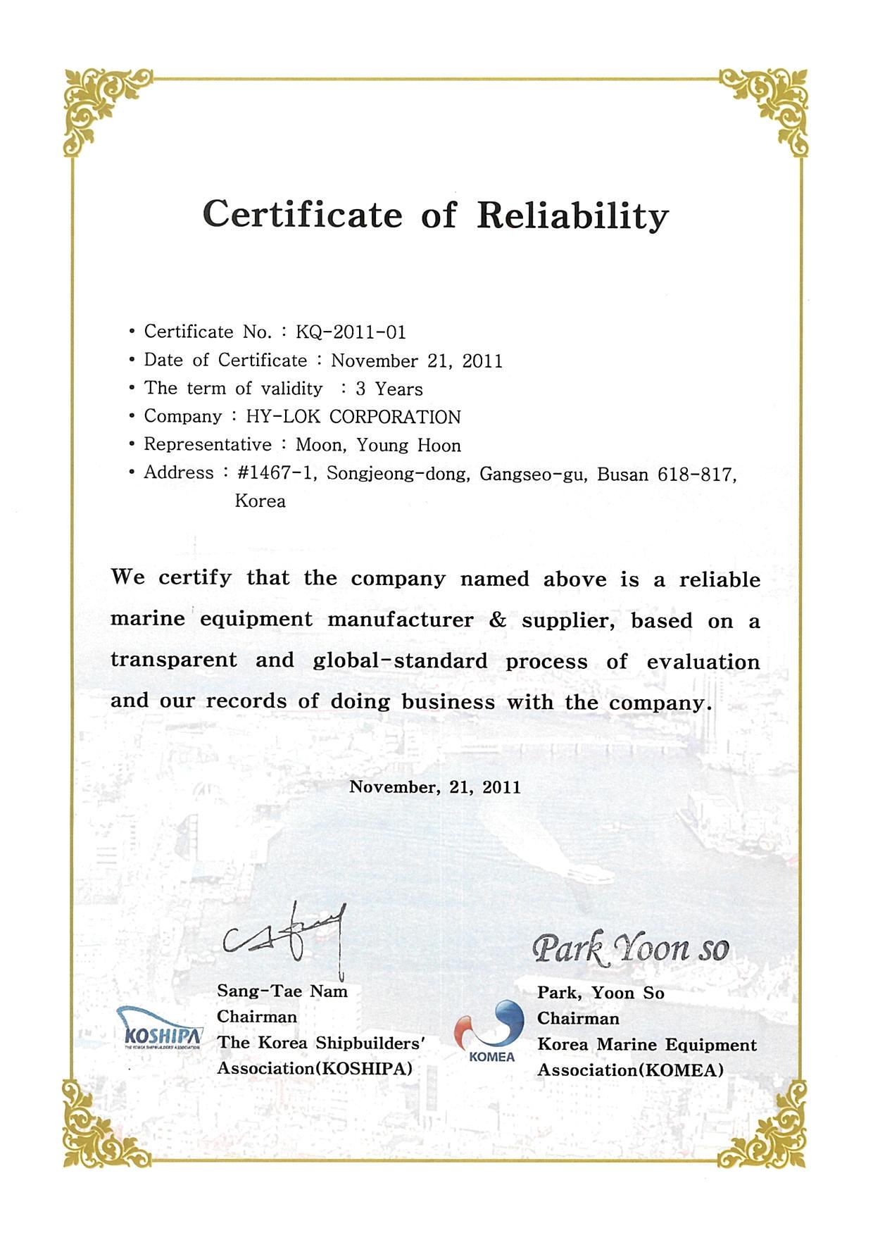 본 인정서를 당사의 품질에 대한 끊임없는 연구와 도전에 대한 보답으로 생각하며 고객의 요구에 더욱 만족시키기 위해 노력을 다하겠습니다.