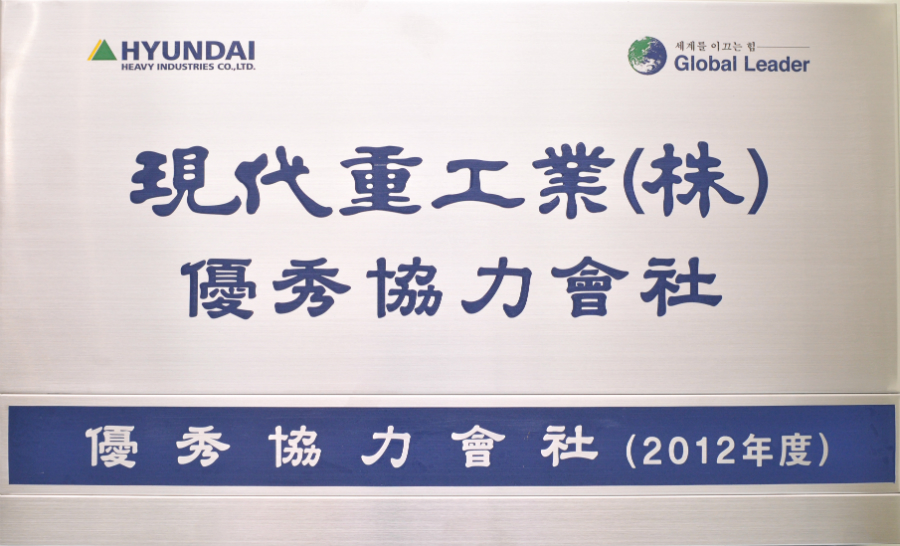 현대중공업으로부터 품질개선과 납기준수 노력으로 생산성 향상과 고객 신뢰도 증대에 기여한 공을 인정 받아 2012년도 우수협력회사로 선정되었습니다.