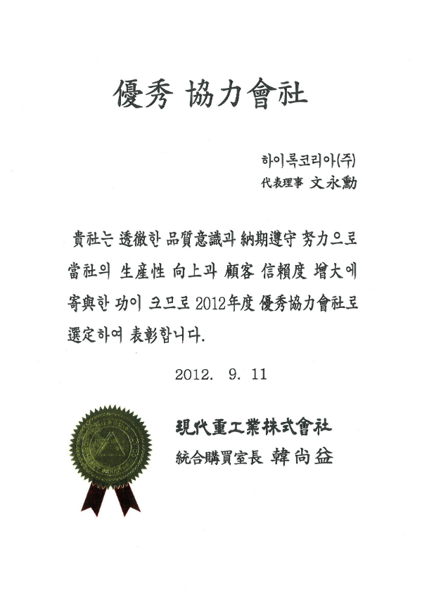 하이록코리아는 2012년 9월 11일 현대중공업으로부터 우수협력회사에 선정되었습니다.