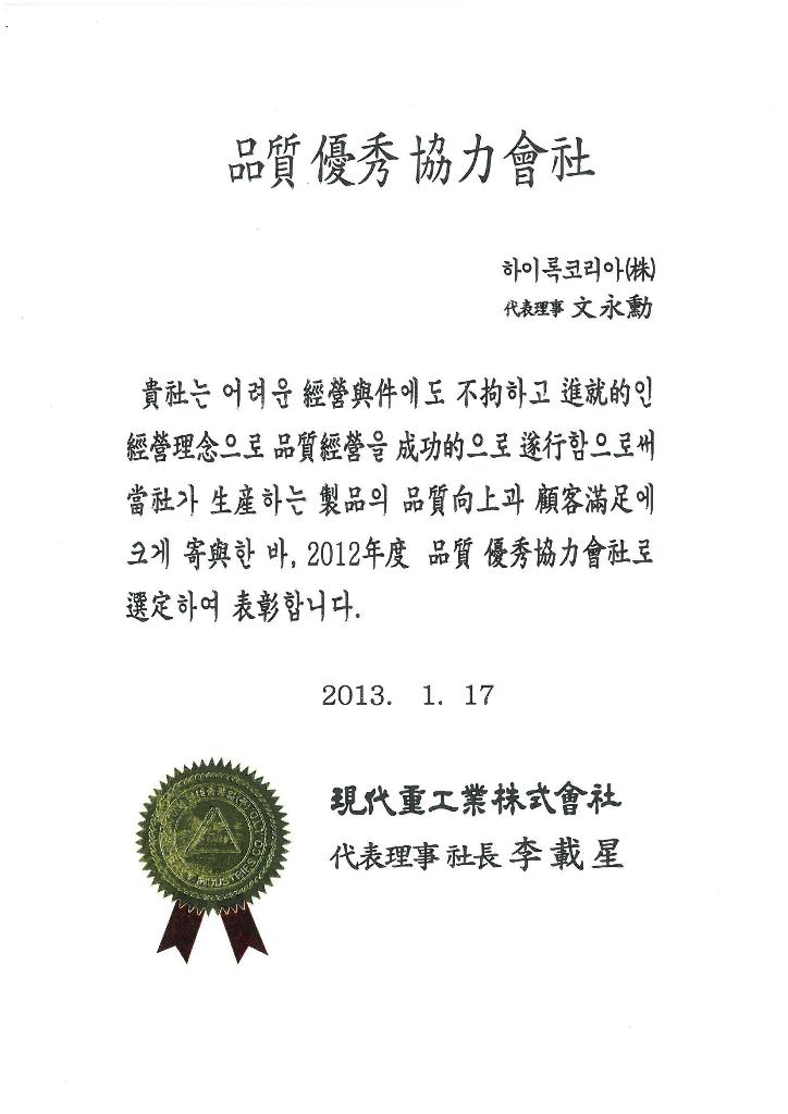 하이록코리아(주)는 2013년 1월 17일 현대중공업(주)으로부터 품질 우수 협력회사로 선정되었습니다.