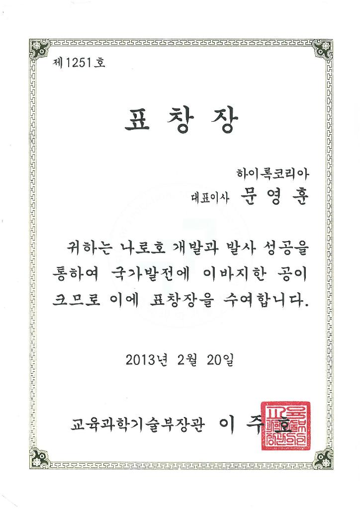 하이록코리아(주)는 2013년 2월 20일 교육과학기술부 장관으로부터 나로호의 성공적인 발사에 대한 공로를 인정받아 표창장을 수상하였습니다.