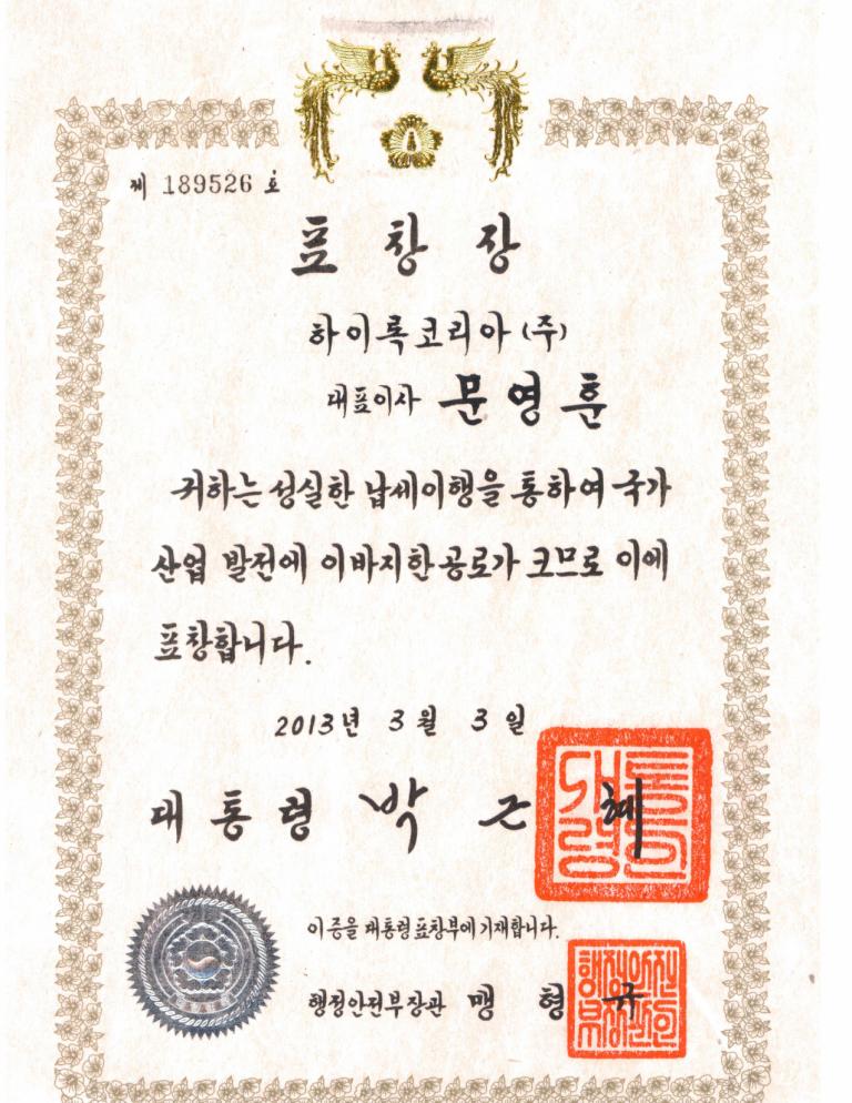 하이록코리아(주)는 2013년 3월 4일 제47회 납세자의 날을 맞아 모범납세자로 선정되어 대통령 표창을 수상하였습니다.