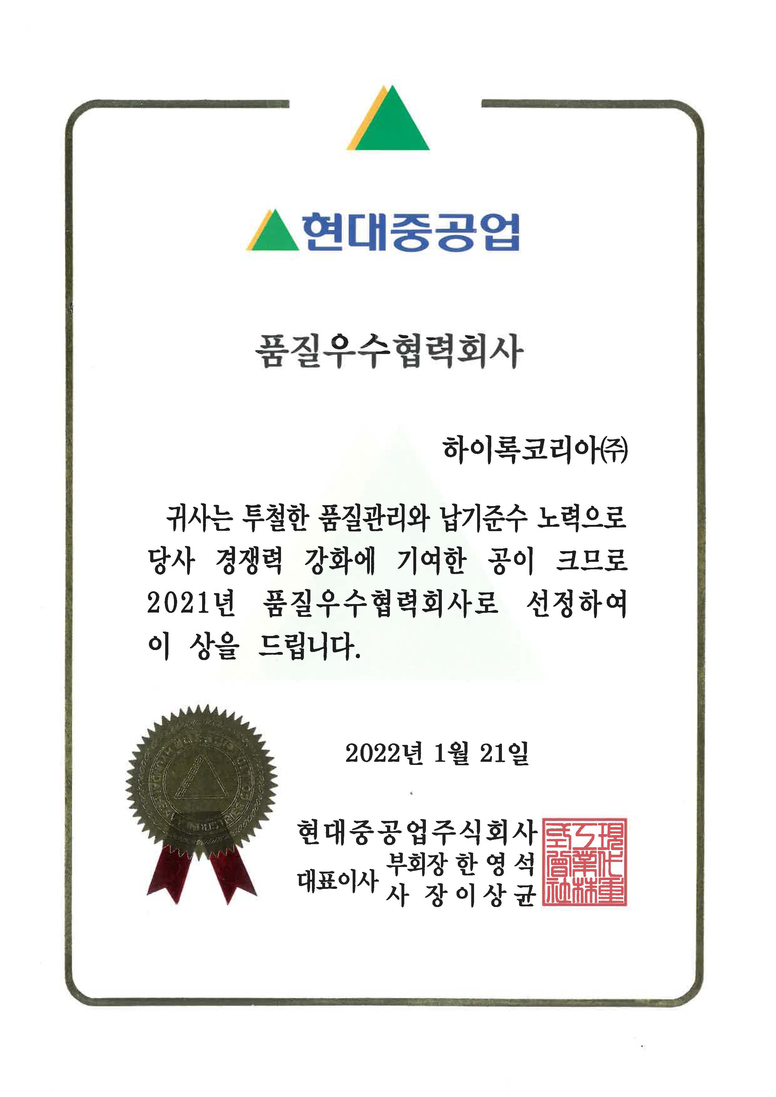 하이록코리아(주)는 1월 21일 현대중공업으로부터 투철한 품질관리와 납기준수 노력으로 고객사 경쟁력 강화에 기여한 공로를 인정받아 2021년 품질우수협력회사로 선정되었습니다.
