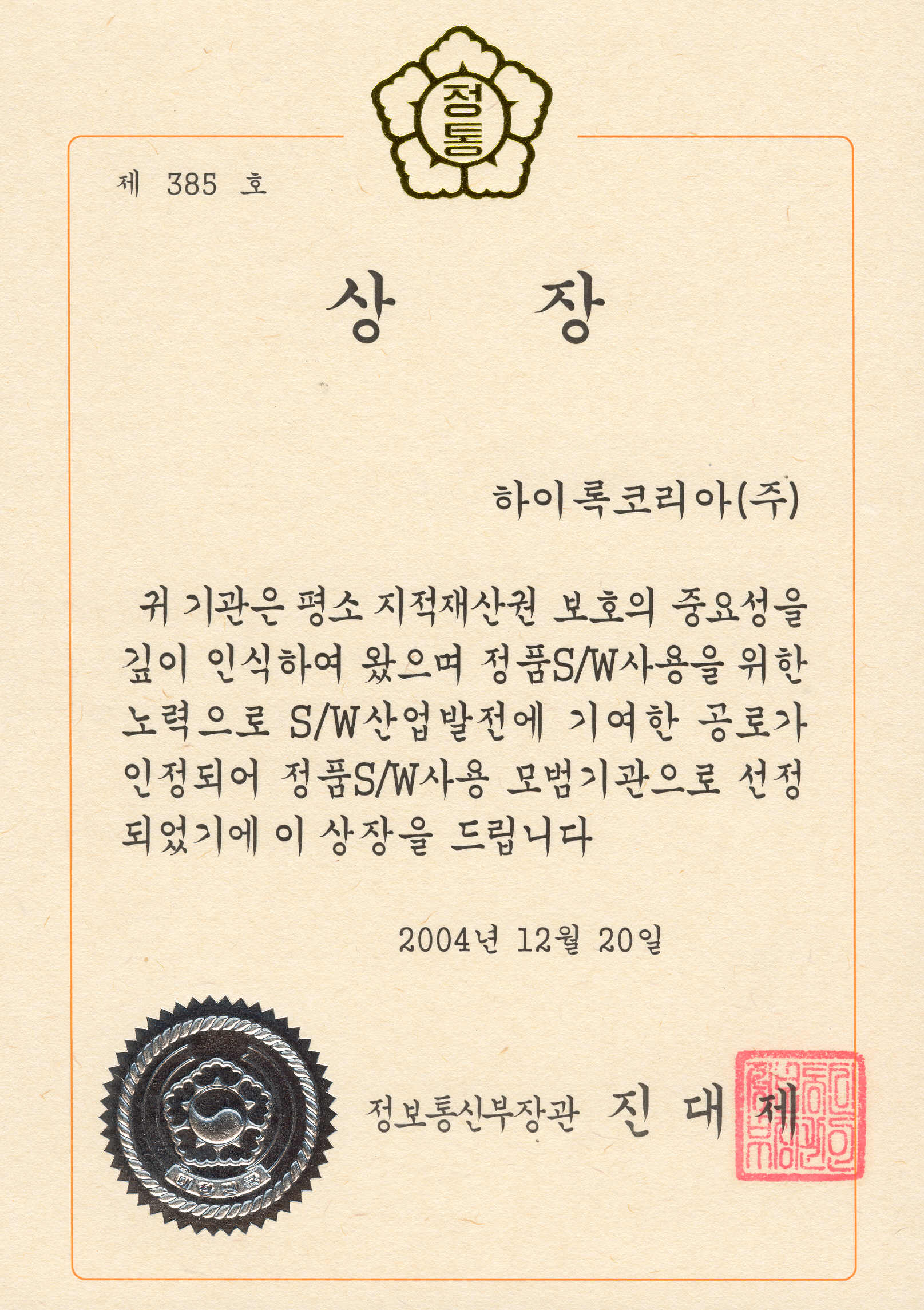 정보통신부는 20일 14층 중회의실에서 올해 정품 소프트웨어 (SW) 사용 모범기관으로 하이록코리아 등 9개 기관을 뽑아 시상했다.