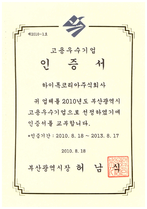 2006년 12월 26일 하이록코리아는 부산 경제 활성화를 선도할 혁신역량을 보유한 기업으로 부산광역시 전략사업의 선도기업으로 선정 되었다.선정된 기업은 인증서 발급과 더불어 중소기업 자금 지원 및 기술개발 지원과 전시회 참가 지원의 혜택을 받을 수 있다.부산시는 앞으로 성장 잠재력을 보유하고 있는 중견기업을 계속 발굴 하여 지역경제의 뒷받침과 선도기업 육성을 위한 지원 시책을 발굴할 계획이다