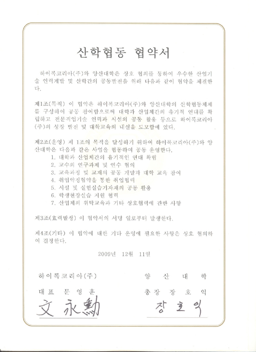 하이록코리아㈜는 우수한 기술인력 확보 및 산학간의 공동 발전을 위해 지난 12월 11일 양산대학 본관 3층 국제회의실에서 양산대학과 산학협동 협약을 체결했습니다.